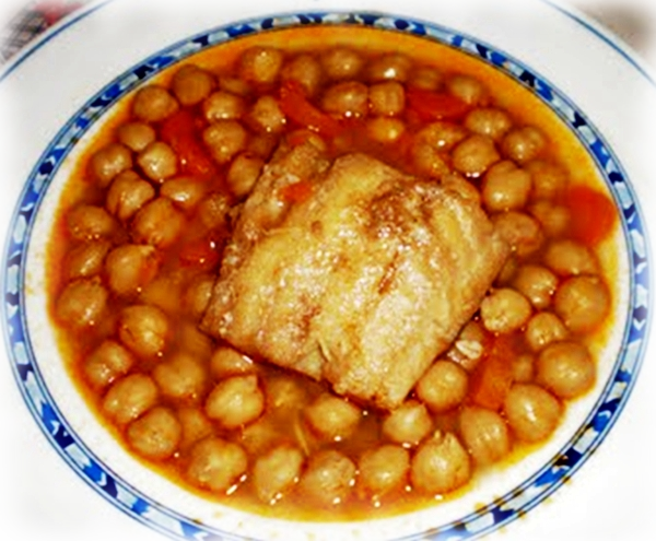 En un sartén grande sofreír la cebolla y el ajo, hasta que se ablande, agregar el vino e ir moviendo con una paleta de madera hasta que evapore el alcohol, poner los garbanzos y dejar ablandar un poco, luego poner los lomos de bacalao con la piel hacia abajo, cocer a fuego lento con la tapa, para que el bacalao sude sobre los garbanzos y se cueza al vapor, una vez que ablande, espolvorear con cilantro picadito, agregar un chorrito de aceite de oliva y jerez.