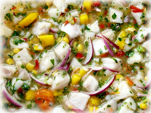 El ceviche para atenuar la acidez lleva algo dulce. En algunas latitudes como Hawái usan mango, en Perú usan batata dulce (al gusto)