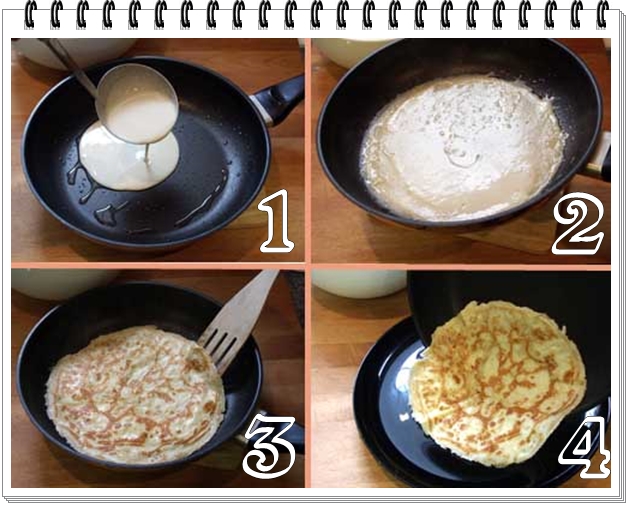 Rápidamente, dando un movimiento circular a la sartén, extendemos la masa por toda la superficie, hasta que quede muy fina.