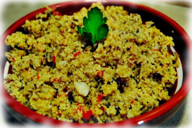 Coloca el cuscús sobre una fuente amplia y vierte por encima la salsa (la misma cantidad de salsa que de cuscús y un poco más). Mezcla bien y tapa. Deja reposar durante 5-10 minutos para que absorba bien todo el líquido.