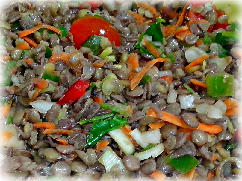 En un bowl para ensaladas ponemos las lentejas, añadimos el picadillo de vegetales, los tomates cherry y el cilantro, mezclamos todo y aderezamos con la salsa y espolvoreamos con orégano.