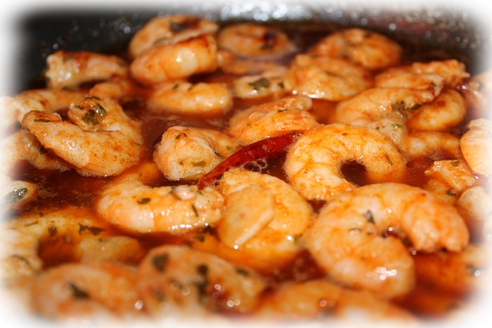 Mezclar el aceite de oliva, el pimentón dulce y picante junto a la pimienta de cayena y sal al gusto. Pelar las gambas y remojarlas en la mezcla, dejarlas marinar al menos durante 30 min, Pasado este tiempo, saltearlas en una sartén con aceite de oliva y espolvorearlas con perejil picado