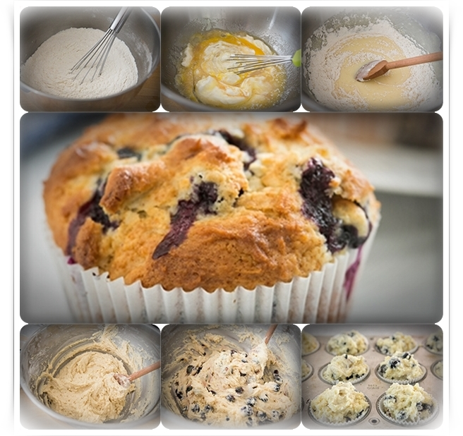 Colocamos los arándanos en un tazón y lo espolvoreamos con 1 Cda de harina para cubrir. (La harina evitará que los arándanos se hundan en la mezcla mientras se cocina.) Reservamos