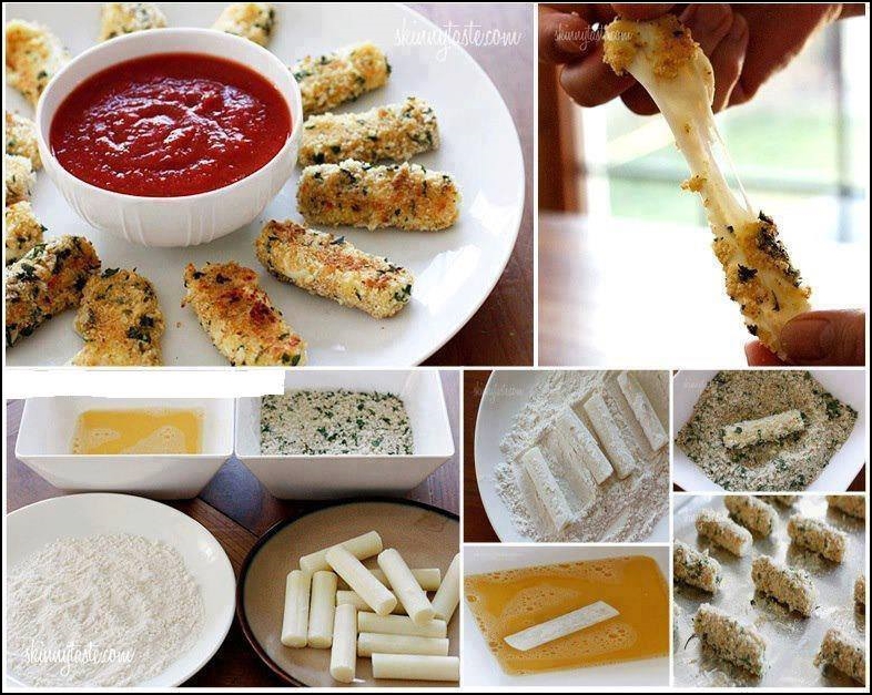 Tomar un trozo de mozzarella y rodar en la harina y luego sumerja en el huevo antes de rodar de nuevo en el pan rallado. Colocamos en una bandeja de silicona para hornear.