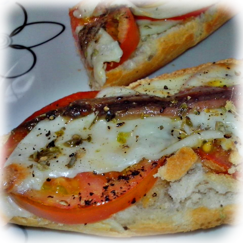 Le agregamos un chorrito de aceite, añadimos una rodaja de queso mozzarella, las rebanadas de tomate, luego otra rodaja de queso mozzarella, las anchoas al gusto y espolvoreamos con un poco de orégano.