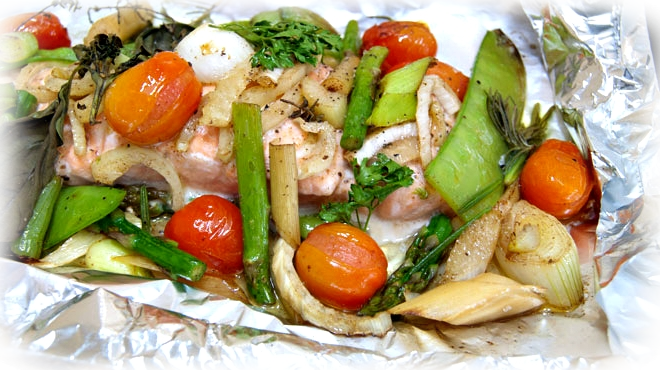 Colocamos las verduras y el salmón en un papel de aluminio, se le añade un chorrito de aceite de oliva y sazonamos con las diferentes especias y envolvemos a modo de papillote, para que se conserven todos los sabores.