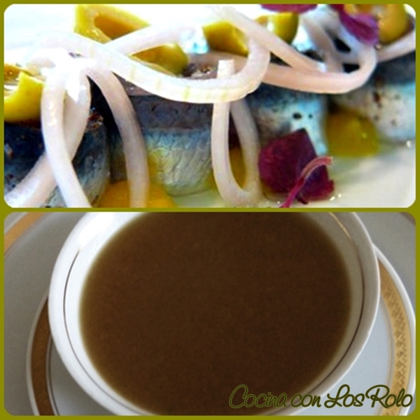 Poner a hervir una olla con 2 litros de agua, agregar todas la cebolla, puerro, ajo y aji dulce picaditos, poner las sardinas, corregir de sal y cocinar por 20 min, una vez transcurrido este tiempo se deja en reposo el consomé, luego se licua todo, se cuela y se guarda en un envase en el refrigerador.