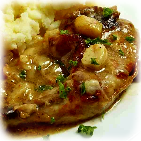 Salpimentamos el pollo sin piel, ponemos en una cazuela aceite de oliva y ponemos a dorar el ajo (sin pelar). Cuando empiecen a tomar color agregar el pollo, añadimos también las hierbas, al gusto, tomillo, romero y un poco de perejil picado y un par de hojas de laurel para aromatizar el aceite. Rehogar sin olvidarnos de remover hasta que el pollo empiece a dorarse, incorporamos el vino y dejaremos reducir, una vez que el vino haya reducido y el pollo está completamente dorado, unos 15 minutos en total, incorporar el vinagre y dejamos que evapore y listo.