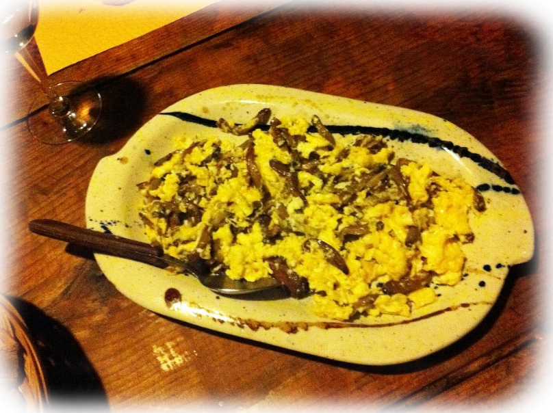 Añadimos ahora aproximadamente unas 3 o 4 cdas soperas de aceite de oliva en una sartén, y cuando esté caliente, añadimos la cebolla una vez picada. Pocharemos el preparado y cuando empiece a coser agregamos los taquitos de ajo, e inmediatamente después; las setas. Cuando las setas estén hechas, escurrimos el agua que puedan haber soltado en la sartén, y añadimos las gambas.