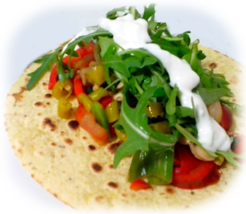 Calentar las tortillas de trigo en un grill o en   el microondas por pocos segundos. Rellenar las tortillas de trigo con el pollo y las verduras y unas ruedas de jalapeños (opcional)
