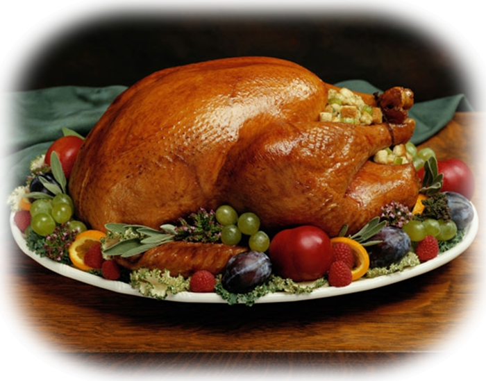 Bajamos la temperatura del horno a 180º y lo horneamos durante 2 horas. Cada 20 minutos rociamos el pavo con los jugos que tenga en la misma bandeja. Apagamos el horno y dejamos reposar ½ hora dentro de él. Pasamos el pavo a una bandeja y adornar.